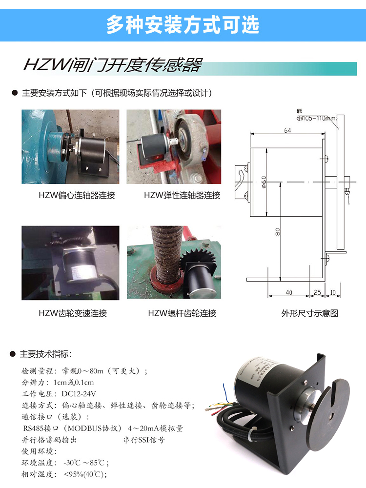 海河HZW型閘位計,一款軸連接式閘位計,用于對閘門開起高度進行檢測,偏心軸連接方式適合安裝于卷揚啟閉機,此閘門開度傳感器采用具有斷電記憶跟蹤功能的編碼器,安裝使用簡單。其輸出信號有并行格雷碼、串行RS485、4-20mA標準模擬量以及SSI同步串行信號等多種方式供用戶選擇。